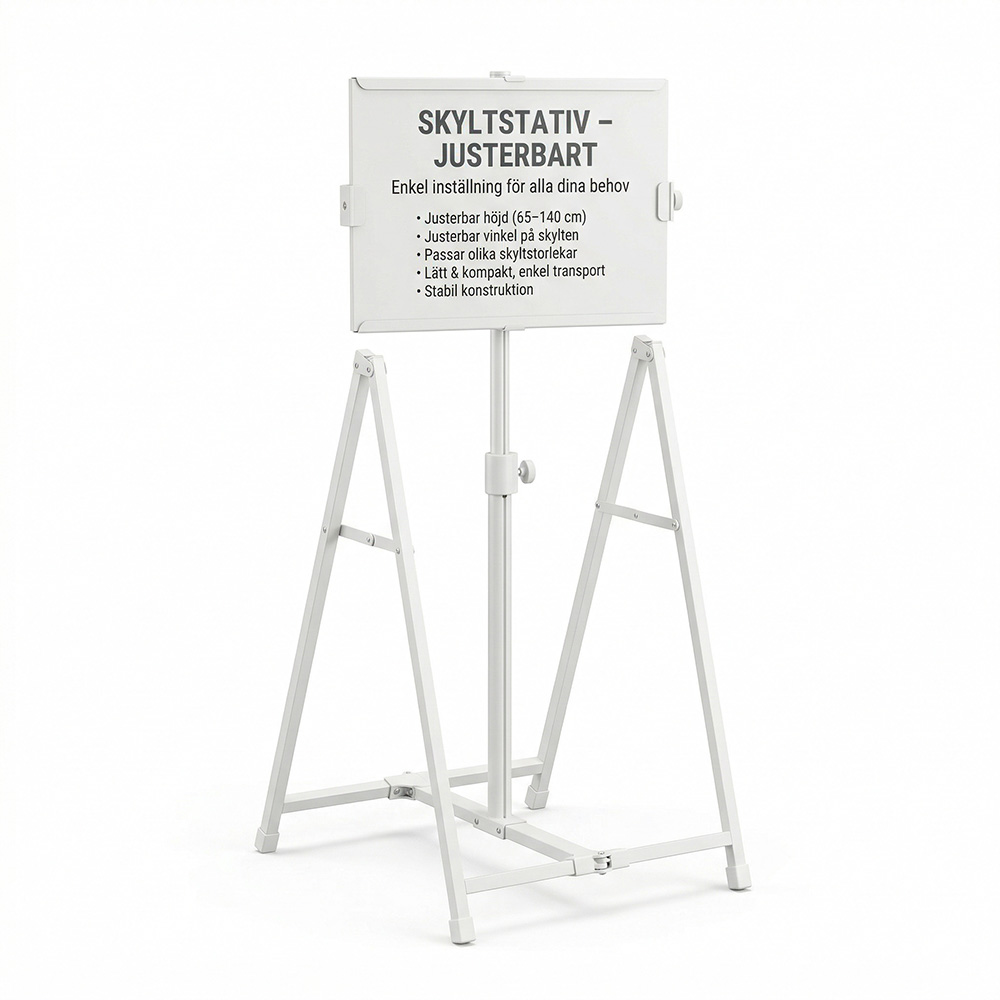 Ett justerbart skyltstativ som ger flexibilitet för olika skyltstorlekar.